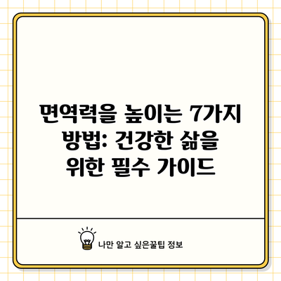 A1: 면역력을 높이는 7가지 방법은 균형 잡힌 식사, 규칙적인 운동, 충분한 수면, 스트레스 관리, 손 씻기, 장 건강 관리, 금연과 금주입니다.